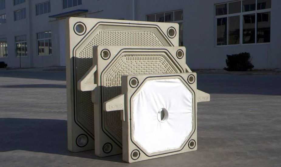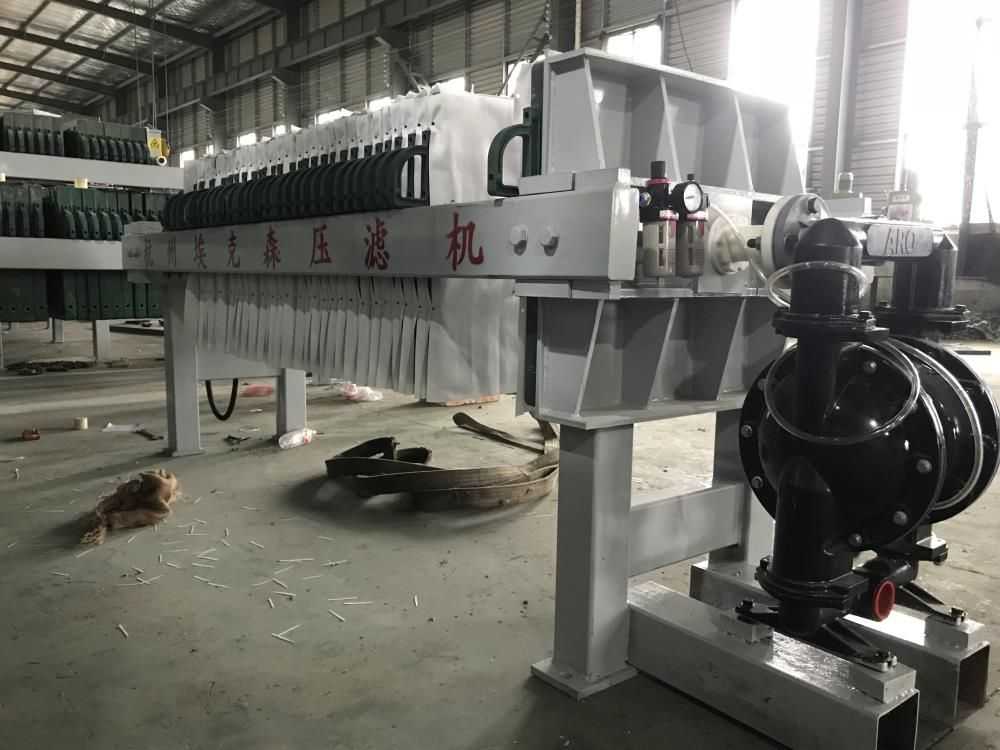 隔膜壓榨壓濾機(jī)是由隔膜板和廂式濾板排列組成濾室,在輸料泵的壓力作用下將料漿輸入濾室,通過過濾介質(zhì)(濾布)將料漿中的固體和液體分離,當(dāng)料漿中的固體形成餅后,再向隔膜通入空氣,對(duì)濾室內(nèi)的固體充分壓榨。